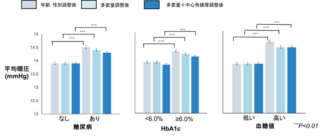 また、糖尿病も緑内障リスクを約1.5倍増加させる6ことがメタアナリシスにより示されており、国内の大規模住民調査でも、血糖値およびHbA1cが眼圧と正の関連を示し、この関係は角膜厚調整後(注:血糖値が高いと角膜厚も厚くなるため、眼圧が見かけ上高くなることが知られている)も有意であった(下図)7。高血糖は線維柱帯における終末糖化産物(advanced glycation end-products: AGE)の蓄積8やフィブロネクチンの増加9を介して、房水排出障害を引き起こし眼圧上昇に寄与する可能性がある。したがって、血糖コントロールは高眼圧予防の観点からも重要であると考えられる。
